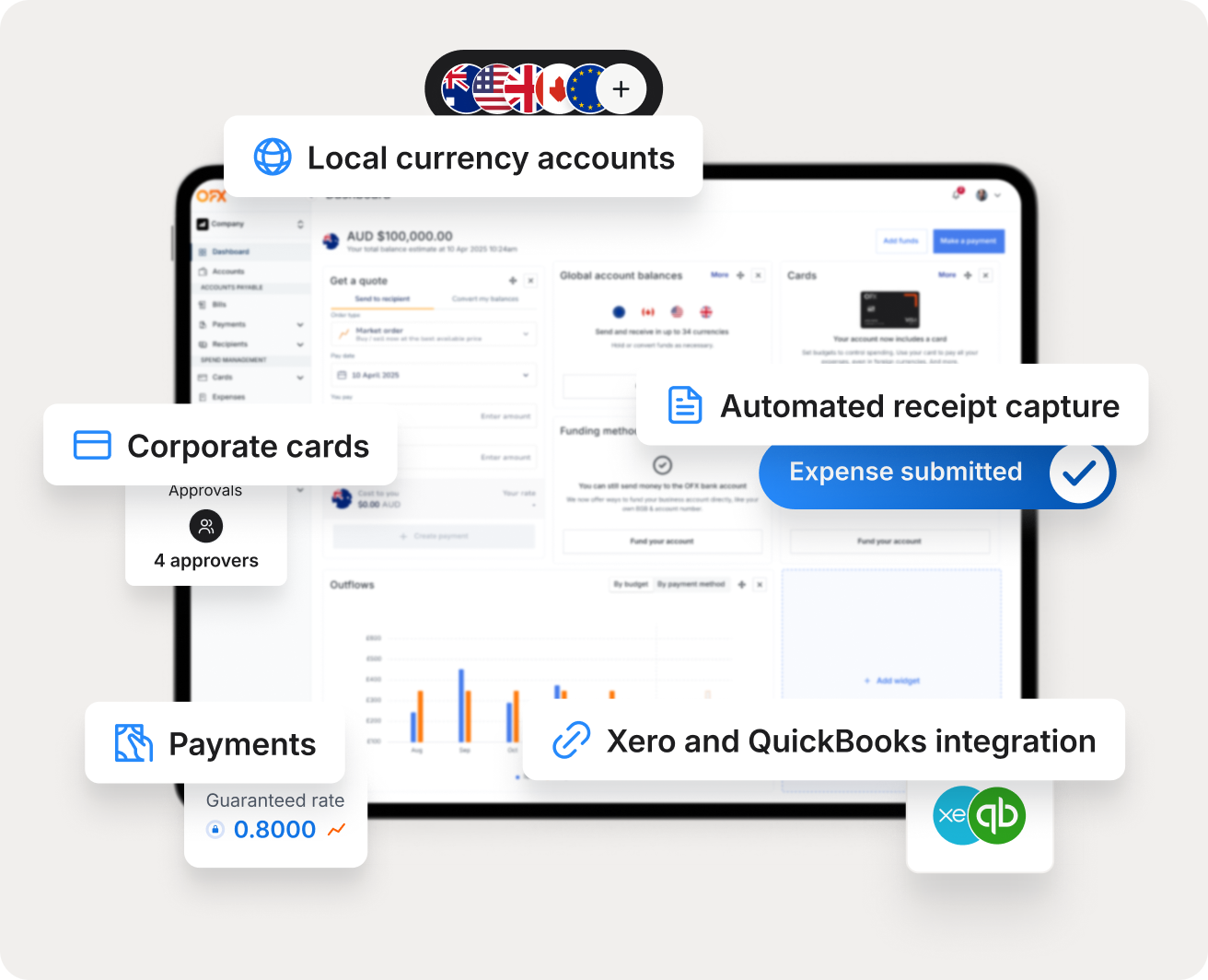 Collect, hold and pay in 30+ currencies and access local bank details in USD, CAD, GBP, EUR and AUD in minutes to pay like a local.