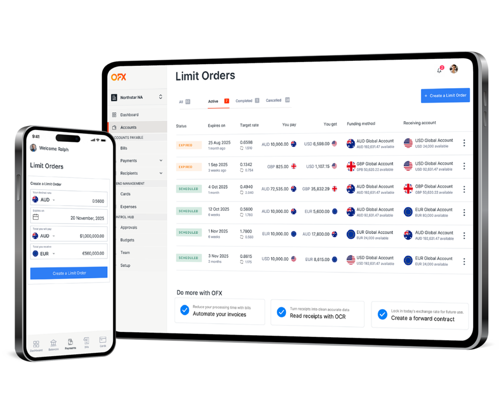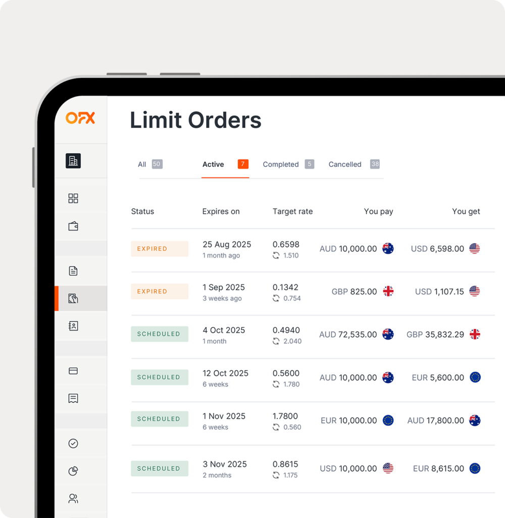 At OFX, our Limit Orders allow you to set your targeted rates across 10+ currencies on the platform.