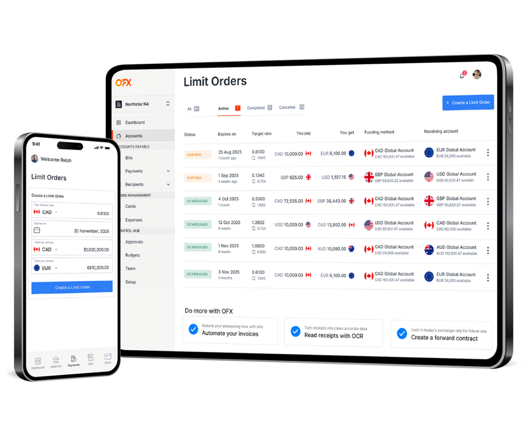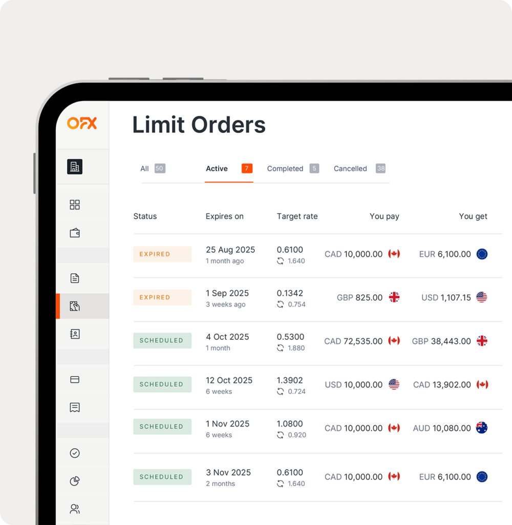 A Limit Order allows you to automatically convert currency once a specific target exchange rate is met, giving you control over your FX transactions without needing to monitor the market constantly. You set your desired rate, and when the market reaches it, OFX processes and confirms the exchange.