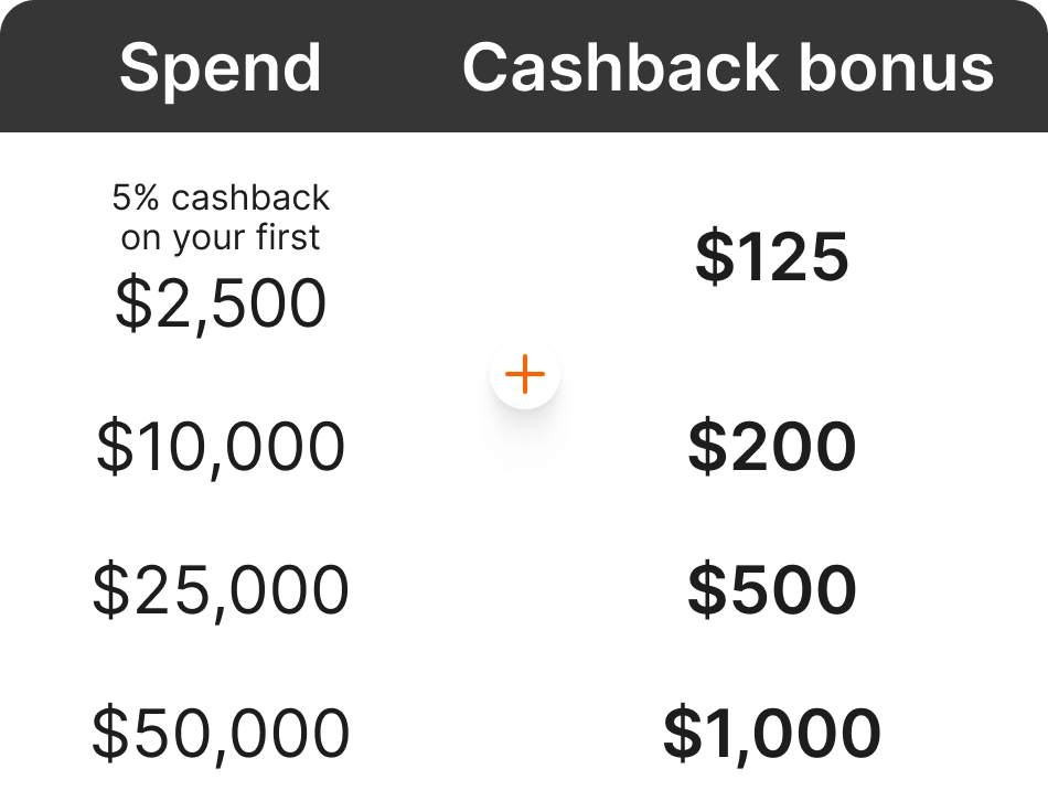 Spend $2,500, get $125 cashback. Plus, as your spend grows, so do your rewards – spend $50,000 across your OFX Corporate Cards before March 31 2026 to unlock your full $1,125 rebate.