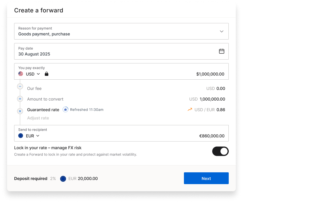 If you like the rate you see today, secure it for up to 12 months. Shield your margins from market swings and plan with confidence.