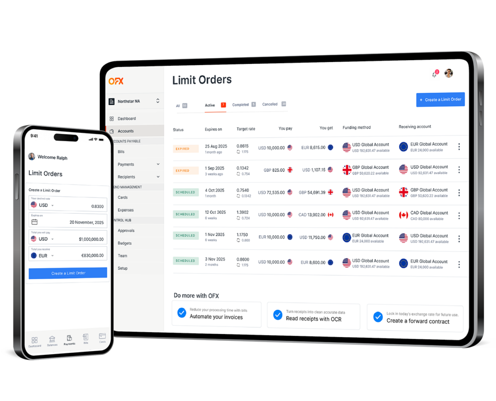 A Limit Order allows you to automatically convert currency once a specific target exchange rate is met, giving you control over your FX transactions without needing to monitor the market constantly. You set your desired rate, and when the market reaches it, OFX processes and confirms the exchange.