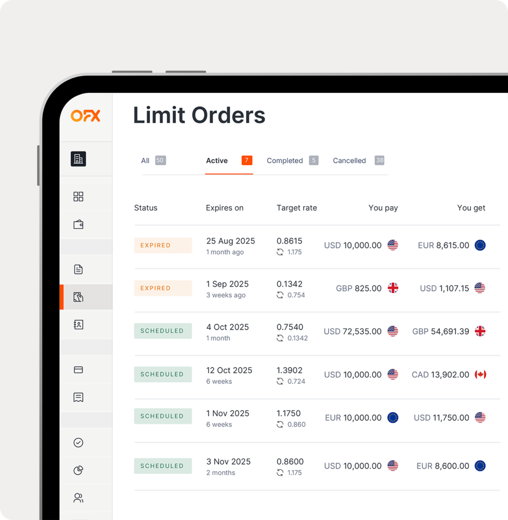 At OFX, our Limit Orders allow you to set your targeted rates across 10+ currencies on the platform.