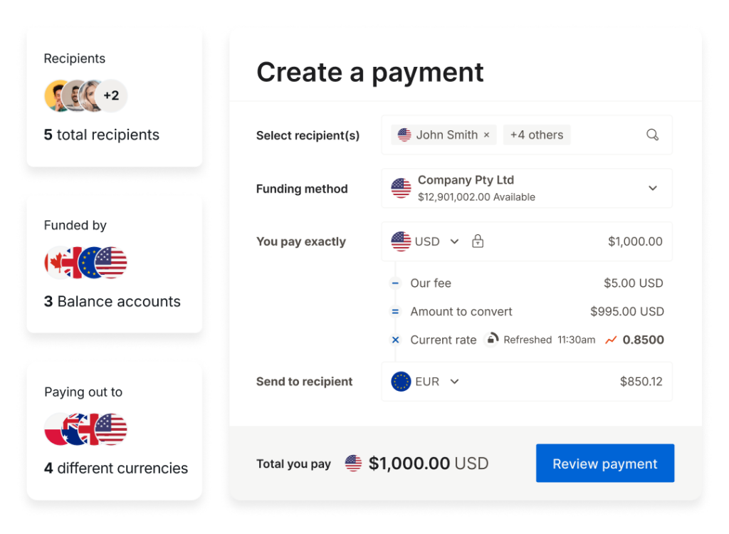 - Competitive FX rates and tools like Spot Transfers and Forward Contracts to manage currency risk.